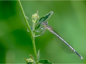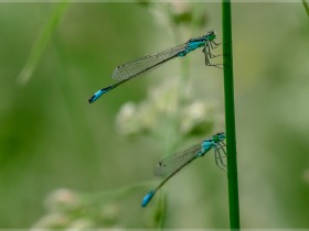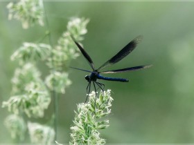 Hier der Grashüpfer, eine mir unbekannte Libelle (Jungferlibelle?), eine gebänderte Prachtlibelle sowie 2 Pechlibellen