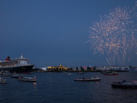 Anfangen möchte ich mit einem Foto der Queen Mary 2, die in Hamburg ihren 10. Geburtstag feierte und am Samstagabend wieder auslief. Dazu gab es ein Feuerwerk und viele Begleitfahrten. Entsprechend dazu waren auch viele Menschen anwesend, um das Kreuzfahrtschiff zu bestaunen.
