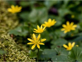 Ein gelbes Buschwindröschen, ein blaues - mir namentlich nicht bekanntes - blaues Pflänzchen und ein Marienkäfer