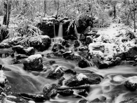 Schönes Fotowetter - Schnee und diffuses Licht - dazu den Bach in braun mit seinen weißen Schaumblasen.