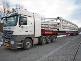 Anfang der Woche hatte ich die Möglichkeit, Fotos eines doch nicht so gewöhnlichen Transportes zu machen. Das Unternehmen, in welchem ich beschäftigt bin, lieferte den ersten Teil des stählerenen Dachtragwerkes für einen Hubschrauberhangar auf dem Heeresflugplatz in Rheine aus. Die Dachträger hatten eine Länge von 35,0 m und eine max. Breite von 5,50 m. Im Endzustand überspannen die Träger dann eine Länge von 67,0 m. Hier ein paar Fotos, wo die Schwertransporter auf dem Firmengelände am Nachmittag vor der Abfahrt stehen.